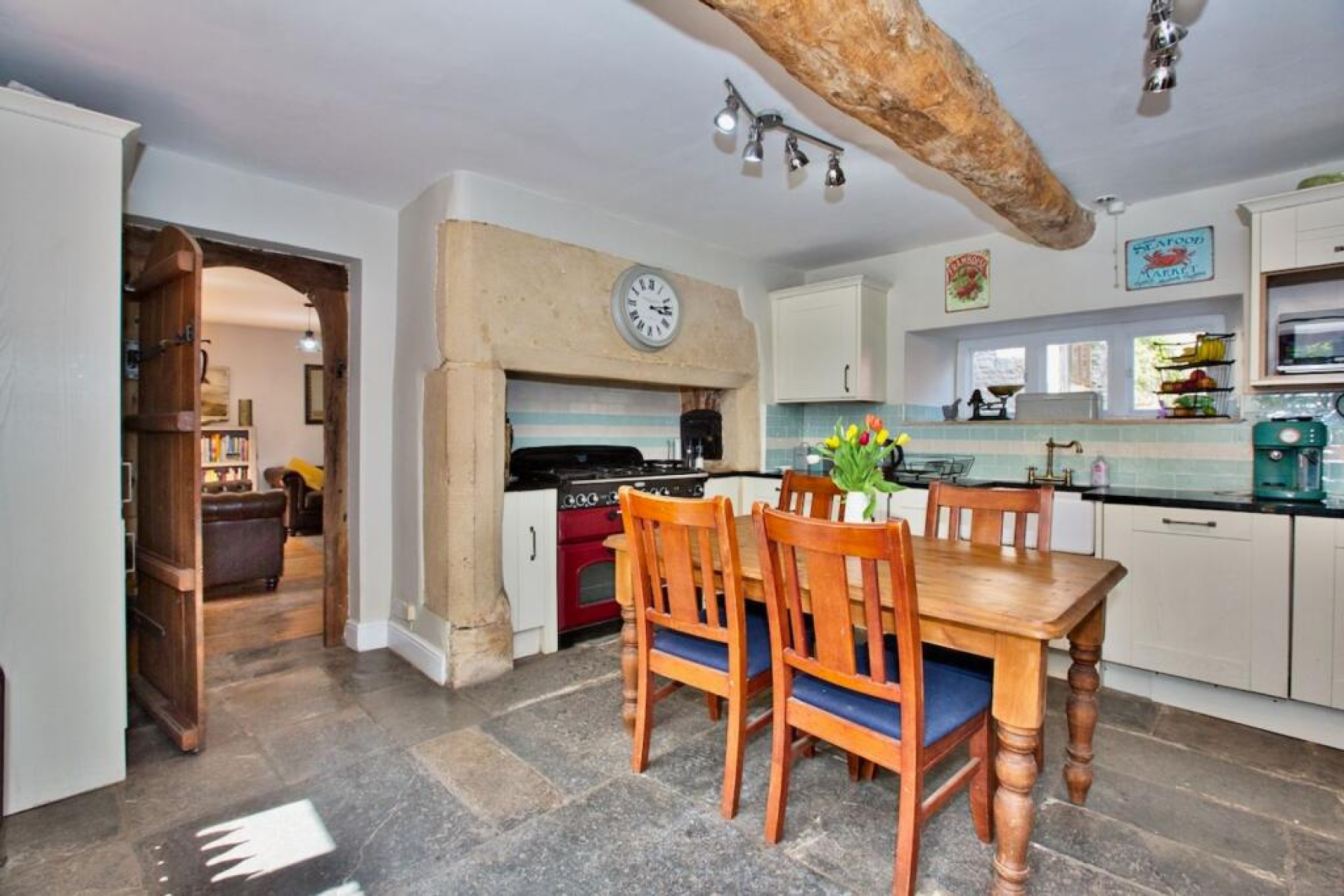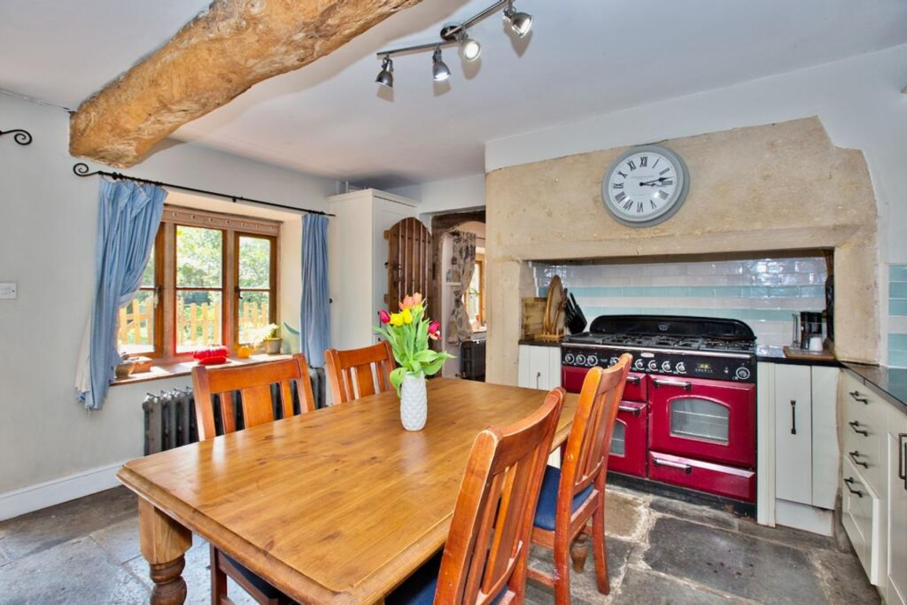Upon entering through the stained-glass front door, you are welcomed into a warm and inviting kitchen, where flagstone flooring and an aged oak beam set the tone for the home's rustic appeal. Granite work surfaces complement the shaker-style units, incorporating a Belfast sink and an integrated dishwasher, while a range cooker, framed by a Bath Stone lintel, serves as a striking focal point. Adjacent to the kitchen is a utility room, offering additional storage, a sink, and space for a washing machine.